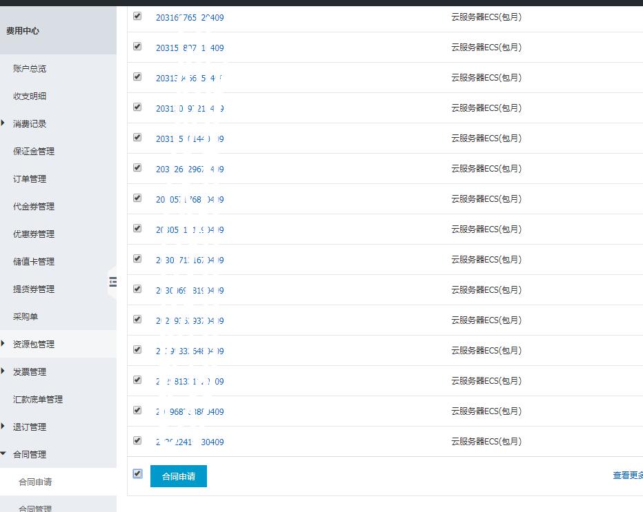 一般的企业采购产品都是需要先有合同,才能找财务申批的,我们这里指的合同一般是指阿里云服务器租赁协议,那么阿里云的合同在哪里申请呢?假设您已经通过代理注册了阿里云会员,那么您可以在官网下完订单后,通过费用中心-合同申请-填写公司相关的资料即可申请合同。